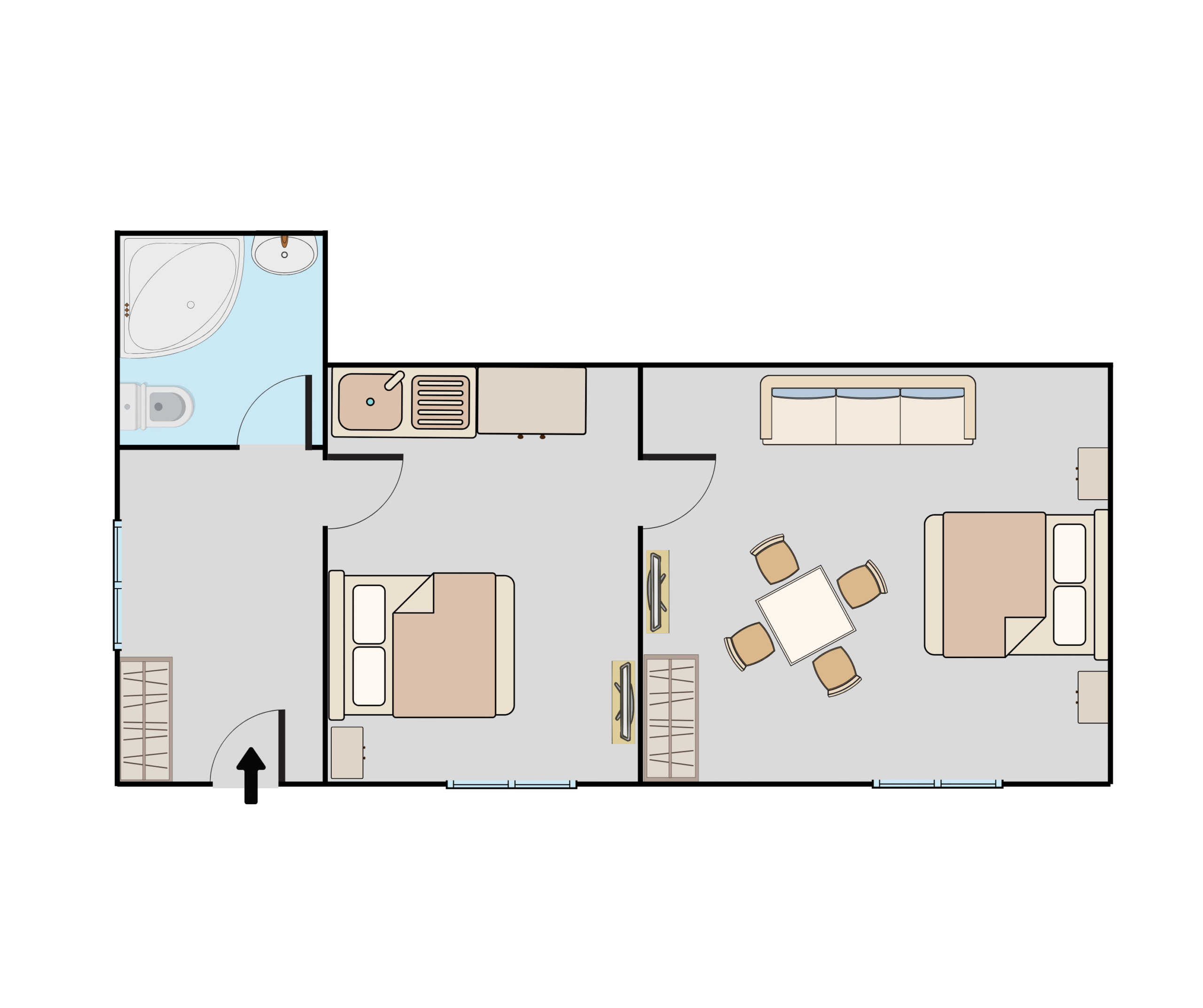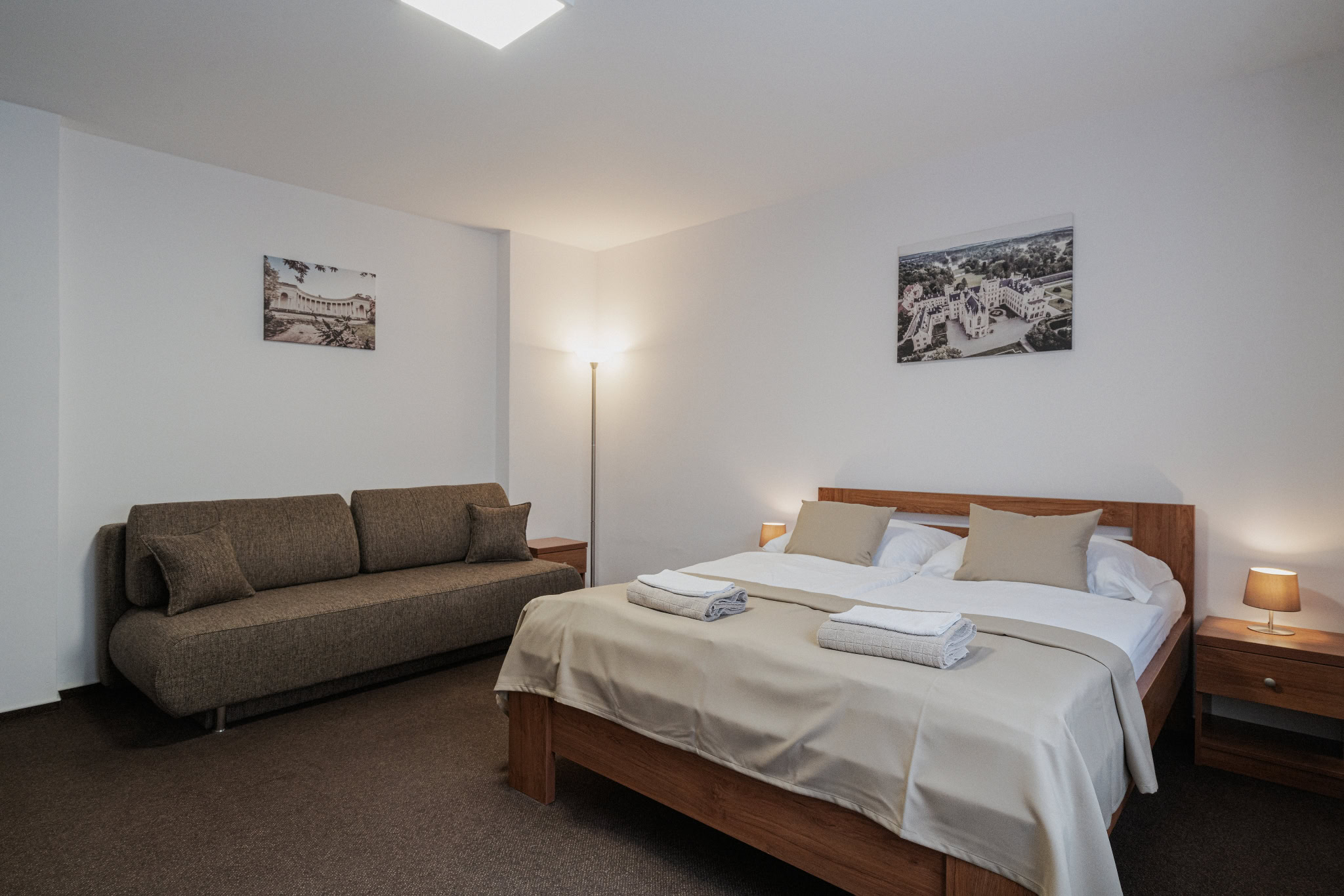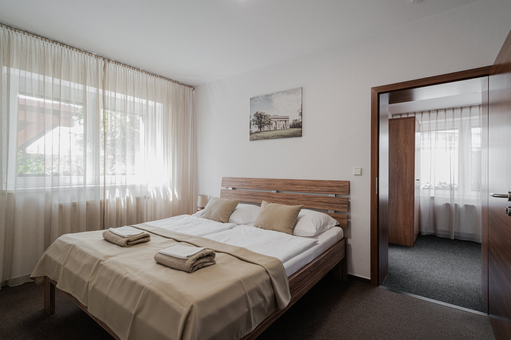 Popis: apartmán má dvě oddělené ložnice s manželskou postelí. V jedné z ložnic je rozkládací pohovkou, která může posloužit jako další lůžko pro 2 osoby. Apartmán je pak možné využít až pro 6 osob (nutné doobjednat). V apartmánu dále naleznete vlastní sociální zařízení, rohovou vanu, kosmetickou výbavu, Wi-Fi připojení, vysoušeč vlasů a další dle ikonek v odstavci Vybavenost.