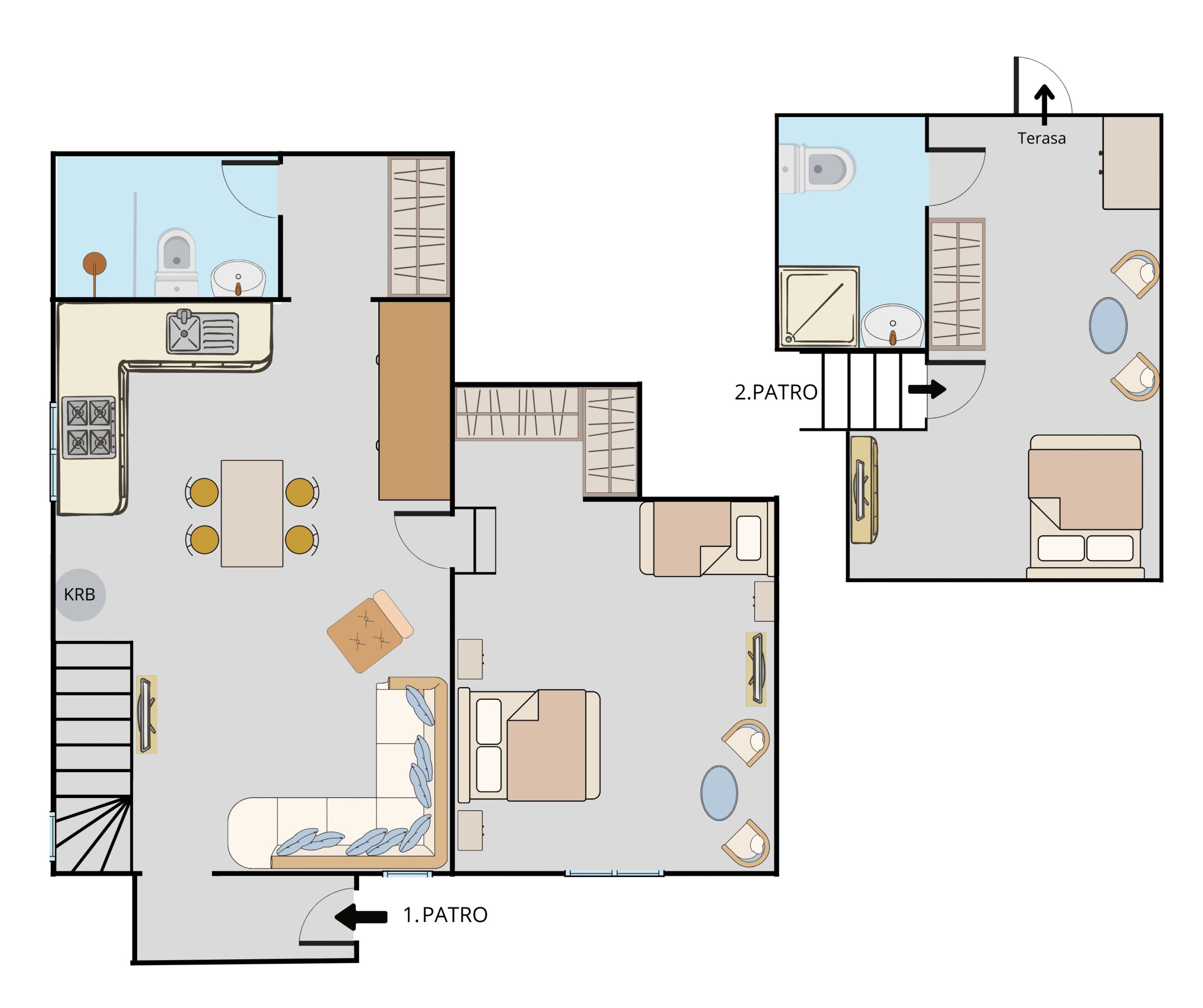 Ve druhém patře se nachází další ložnice s manželskou postelí, televizí, další koupelnu se sprchovým koutem a toaletu. Disponuje vlastní prostornou venkovní terasou s grilem.
